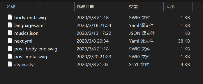 首先去 https://github.com/theme-next/hexo-theme-next/releases 下载主题的源码,解压重新命名为 next,然后复制到博客主题目录下并覆盖之前 next 目录下的相同文件,接着对下面这些地方做修改:
